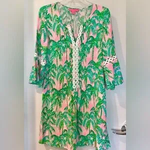 Lilly Pulitzer HOLLIE Tropical Pink & Green Palm Print Tunic Dress Sz M