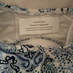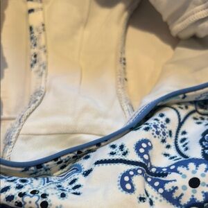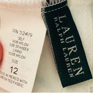 This stylish Lauren by Ralph Lauren squared scoop neck U back blue and aqua paisley design on white one piece swimsuit featuring a beautiful blue piping. Supportive with built in bra cups. Size 12 measures approximately Chest 16" stretches to 20"; Waist 14" stretches to 18". Perfect for a day at the beach or pool. Nearly new condition as pictured.