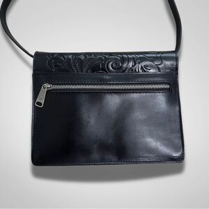 NWOT Patricia Nash Locri Black Tooled Leather Crossbody Purse. Floral engraving with silver buckle closure. Suede interior. Can wear as a clutch. Got as a gift & just don’t wear.