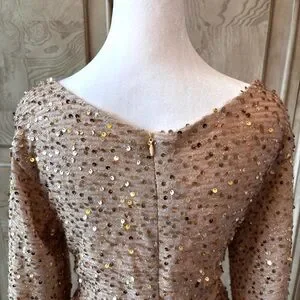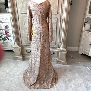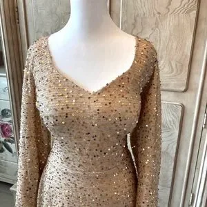 Step into elegance with this stunning floor-length, long-sleeve sequin gown, a showstopper perfect for any gala or red-carpet moment. Its shimmering, silver-toned sequins catch the light with every move, creating a dazzling cascade of sparkle. The fitted silhouette hugs your curves, while the graceful long sleeves add a touch of sophistication. Fully lined for comfort, this gown flows effortlessly to the floor, offering timeless glamour with a modern edge. Ideal for making an unforgettable entrance. New Without Tags, Mint/Excellent Condition, Brand New/Never Worn