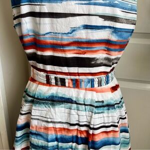 Make a vibrant statement with this sleeveless midi dress by Anthropologie’s Moulinette Soeurs brand in what seems to be a size medium Featuring a bold and colorful horizontal stripe pattern in shades of blue, red, white, and black, this dress is perfect for spring and summer outings. Perfect for brunch, vacations, or weekend strolls. Pair with sandals or wedges for a chic look!