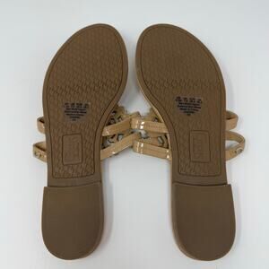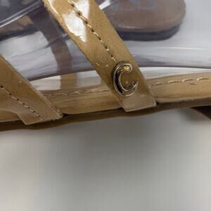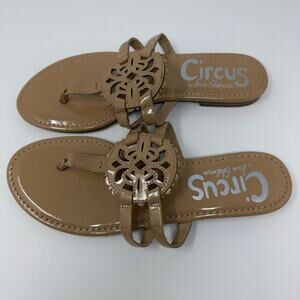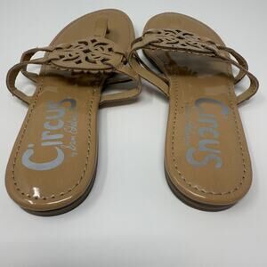 Circus by Sam Edelman Women's Sandals. In the color tan or nude. Tagged size women's 9.5. These Sam Edelman sandals feature a patent leather look, a laser medallion cutout design, a slide on flip flop style and a low flat heel. In excellent used condition with minimal to no signs of wear - EUC.