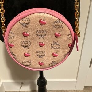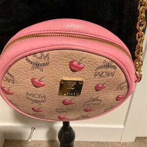 Preloved MCM pink/tan round crossbody with cherries. Gold chain strap. Please review all pictures. Captured picture with ink stains. Pink MCM logo fabric inside with one pocket. Minor fading on leather.