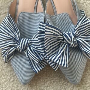 Step out in style with these chic J. Crew shoes. Featuring a striking blue and white striped design, these shoes are perfect for any occasion. The elegant bow adds a touch of sophistication.