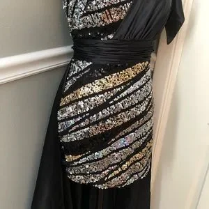 NEW COLORS SZ 4 BLACK SATIN SILVER GOLD SEQUIN ONE SHOULDER DRESS WITH TRAIN
