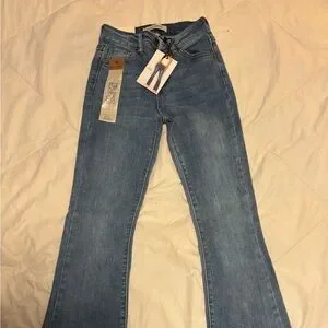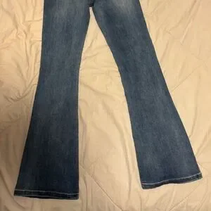 These jeans showcase a stylish flare and wide leg design in a medium blue wash, offering a timeless vintage appeal. The denim is of standard weight, ensuring both comfort and durability for everyday wear.