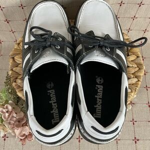 Timberland Boat Shoes Mens Size 11.5 Black & White Leather Deck Shoes PreLoved