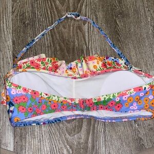Vibrant floral bikini set with a colorful design. Features a strapless top and matching bottoms.
