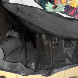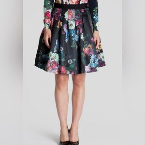 In good preowned condition. Ted Baker London 'FLOWTII' oil painting black floral full skirt. Features all over floral pattern, pleat details, hip pockets, back zipper, and 3 interior liners. Ted Baker size 0 which equates to US size 0/2.