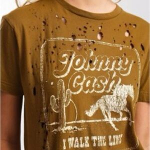 Show off your style with this Johnny Cash distressed brown western themed graphic tee. Featuring a classic brown color, this top is perfect for casual outings. Embrace comfort and music-inspired fashion. Stylish tears, color wash, and rolled edges are throughout the Tee. Perfect to pair with a summer dress, jeans, western hat, and your favorite cowboy boots.