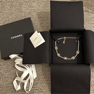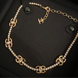 This exquisite CHANEL necklace showcases a harmonious blend of gold and silver tones, featuring the iconic CC logo links interspersed with crystal-studded segments. The adjustable chain extender adds versatility, while the signature CC charm at the end enhances its luxurious appeal.