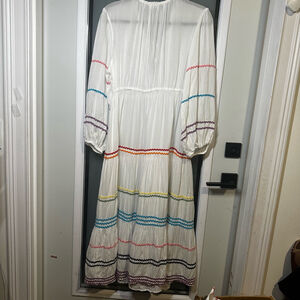 Flirty, fun & effortlessly chic! This pre-owned Blue Island dress in size M is a breezy wardrobe staple. Lightweight white fabric with a flattering V-neck, slight ruffle at the neckline, and beautiful blue tassel tie closures. Long sleeves with elastic cuffs and a stretchy waist offer comfort and shape. Tiered skirt with colorful wavy stitching adds playful movement. In good condition with no visible flaws—perfect for beach days, brunch, or festivals!