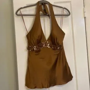 Y2K Brown Silk Halter Tank Top- Beaded, Vintage