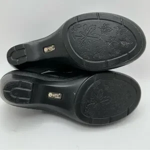 Elevate your casual look with these stylish and comfortable Lobo Solo slip-on mules. The black leather upper features a round toe and a mid-height block heel, perfect for any occasion from winter to summer. The rubber outsole provides durability and traction, while the cushioned features make these mules a must-have for any woman's shoe collection. The solid pattern and classic theme add a touch of sophistication to these versatile shoes. Available in women's US shoe size 9, these Lobo Solo mules are a great addition to any wardrobe.