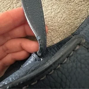 Used condition- Very used. Some cracking on edges of leather, including the straps. Stains in the interior, including very visible pen marks. However, the bag still looks great when worn.