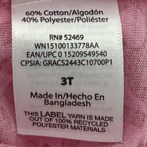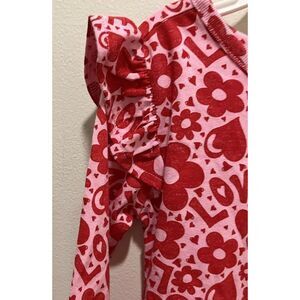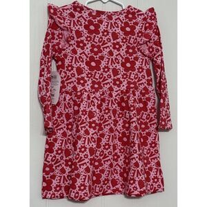This Valentine Dress in size 3T features a heart, love, and floral print in red and pink. It has long sleeves with a casual sleeve design and ruffle accents. The dress has a round neckline and a fit & flare style, perfect for parties or casual wear. Made from a cotton blend knit fabric, this knee-length dress is machine washable and lightweight. Brand: Wonder Nation.