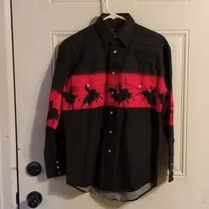 Made with high-quality 100% cotton materials, this white pearl button( snap )-up features a unique color block design and black horses playing on a red background across the chest.