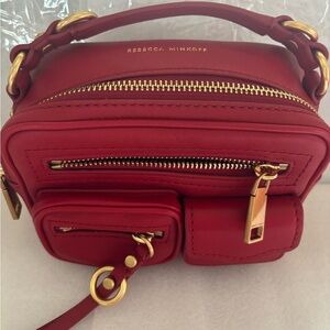 Rebecca Minkoff Leather mini bag. Crossbody/top handle Gold tone hardware, top zipper, two outside zip pockets, one outside slip pocket in the back, one outside flap pocket in front, two inside slip pockets, one inside zip pocket