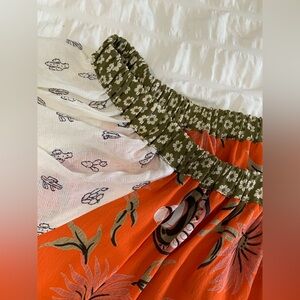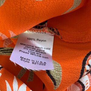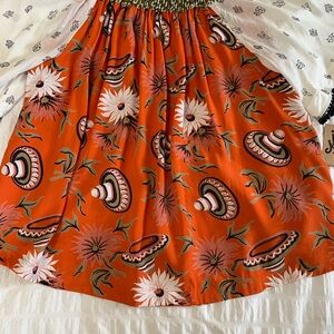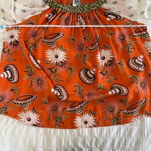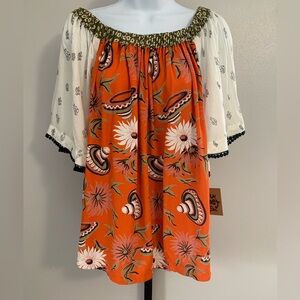 Ivy Jane top with a vibrant orange sombrero design. Features green and white floral accents. Top can be wore on or off shoulder and has short bell sleeves with tiny tassels. Size large is 100% rayon. Top is new with tags but has no retail.