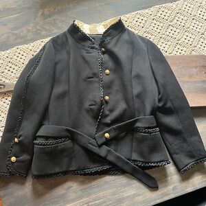 The jacket features stylish gold buttons and intricate detailing, offering a timeless look. Substantial and fully lined