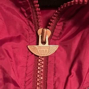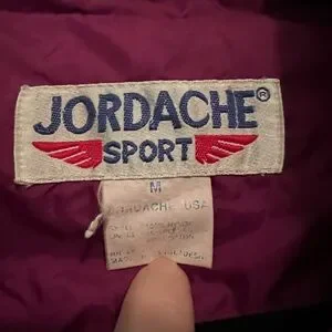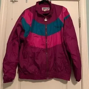 Excellent condition 1990s windbreaker, Jordache Sport brand. Colors are plum, dark turquoise and fuchsia. Oversized. Pit to pit is 25”. Elastic cuffs and hem, side pockets and full zip. Embroidery on left chest says “Standard Equipment, Jordache USA.”
