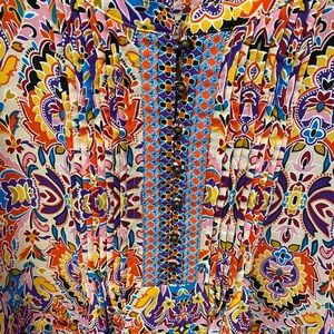Vibrant bohemian blouse with intricate patterns. Features a mix of colors for a lively look. Perfect for casual outings.