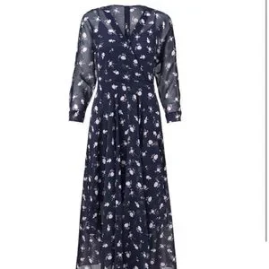 Elegant navy dress with a delicate floral pattern, perfect for any occasion. Navy slip included. Only worn a couple of times. Non-smoking, small dog friendly home.
