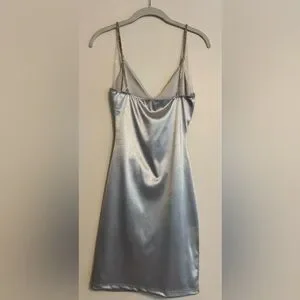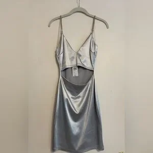 Shimmering silver metallic dress with cutout design. Has slight blue tint to it in person compared to pictures. Perfect for a night out or special event. New with tags, sparkly straps.