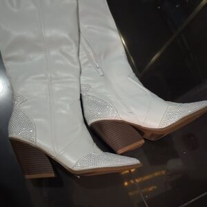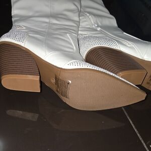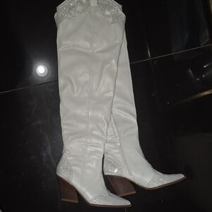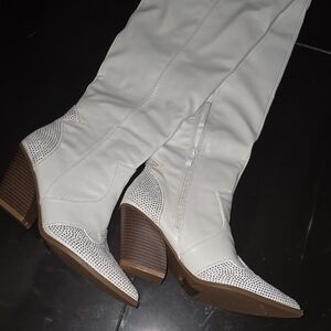 Step out in style with these elegant white knee-high boots. Perfect for any occasion, these boots offer both comfort and sophistication.