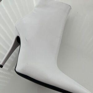 Stiletto white leather ankle boots. Perfect for any occasion, these boots offer both comfort and sophistication. Pointed toe. Side zipper. Elastic detail top sides. Never worn.