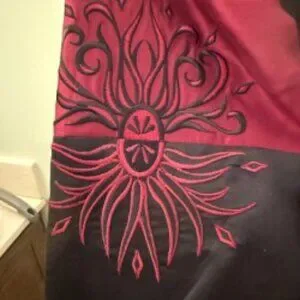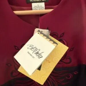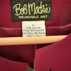 Beautiful Bob Mackie burgundy and black jacket with embroidered design. Sleeves are also embroidered. Size large, never worn. Excellent condition, includes tags. Elegant and classy, this jacket is a real piece of art! Created by noted American fashion designer Bob Mackie, this jacket will be sure to be an eyecatcher.