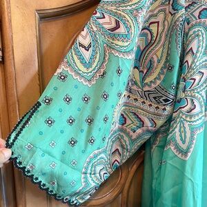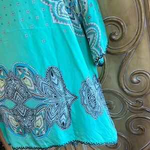 Chic mint green top with mandala design and V-neckline. Lightweight and flowing tunic has a loose fit with short sleeves and. Silk