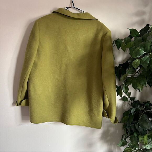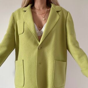 excellent condition, extremely rare blazer. high quality new wool , made in France. Beautiful lime Green Colour. Notched collar, classy elegant. three large front pockets. double buttons closure. folded cuffs.