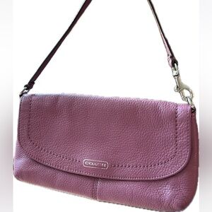 This Coach convertible wristlet / clutch in a delightful purple hue is crafted from pebbled leather, offering a textured and stylish finish. Its compact design is perfect for carrying essentials, making it an ideal accessory for both casual outings and elegant events. The convertible handbag/wristlet style adds a touch of convenience and sophistication to your ensemble. Silver logo and hardware, tons of card slots for organizing! You could even add a crossbody strap and make it a hands free bag.