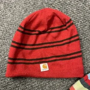 Set of two Carhartt beanies with striped patterns. One in red and black, the other in multicolor stripes.