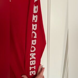 ABERCROMBIE & FITCH men’s long-sleeved t-shirt size S. Great looking vintage styling! Has felt lettering down the sleeve and embroidery on the front. Heavy cotton with a good amount of stretch. EUC