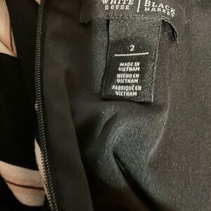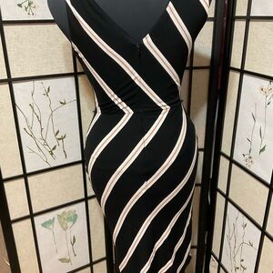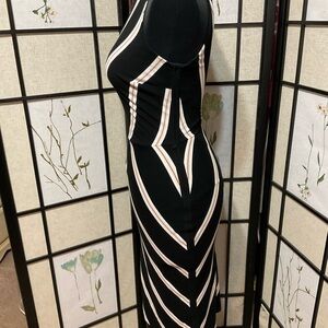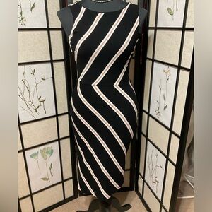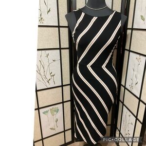 Black background with wavy stripes of white and peach. Has belt loops but belt not included. Any black patent belt would work but fits fine without one. Sleeveless, round neck. Fully lined. Hidden back zipper. EUC