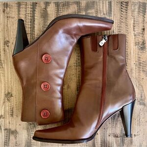 These rare, vintage Donald J. Pliner heeled boots are a beautiful brown leather and in absolutely great condition! Some wear on soles and one button is looser than the others, but still attached well.