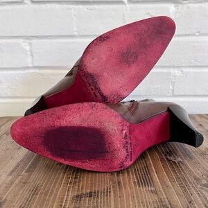 Featuring a sleek design with a pointed toe and a high heel, perfect for adding a touch of elegance to any formal outfit. Crafted in a rich brown leather with striking red accents, they offer a sophisticated and versatile style. Ideal for making a statement at professional events.
