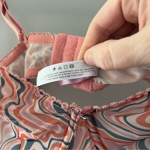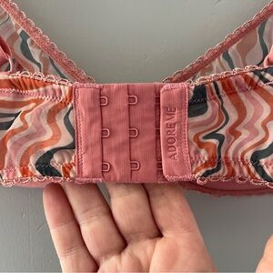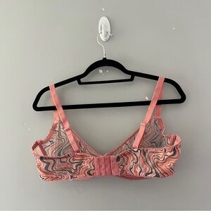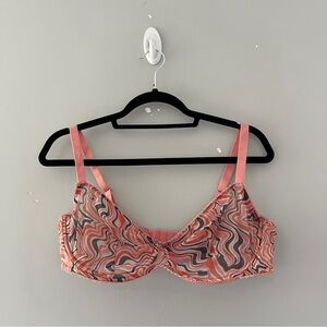 Lightweight, colorful demi bra in a multicolor tie dye print. Sheer cups, underwire. Size 40DD