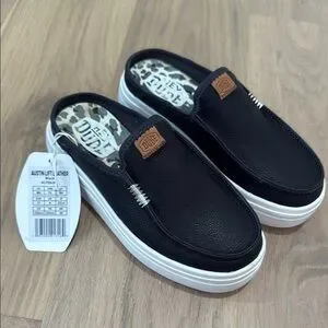 Brand new with tags, never worn. Hey Dude Austin Lift Leather. Leather upper, Platform outsole height 34mm, lightweight. Comes with original packaging and Hey Dude drawstring travel bag.