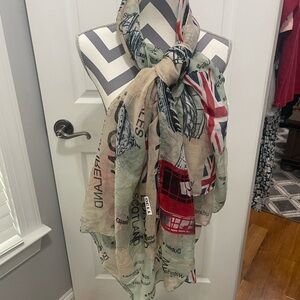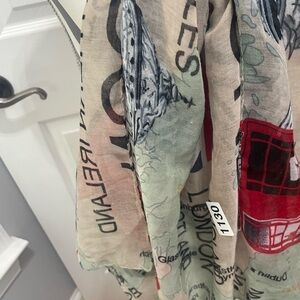 Stylish scarf featuring London-themed prints. Red and black accents add a bold touch.
