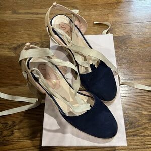 These espadrille wedges from SJP by Sarah Jessica Parker feature a chic two-tone design with a navy blue canvas toe cap and elegant cream ribbon ties. The medium-height wedge is crafted from traditional jute, offering both style and comfort for a perfect summer look.