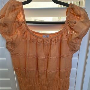 This elegant orange dress is perfect for any occasion. Its vibrant color and stylish design make it a must-have in your wardrobe. It is size small and in excellent condition. Pretty cantaloupe orange color with eyelet detail, elastic waist and cap sleeve- very flattering