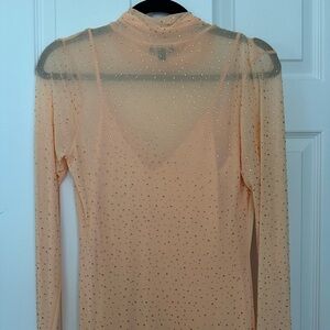 In a sheer Peach Fuzz color power mesh highlighted by a all over rhinestones, the Shailene dress features a turtleneck and fitted midi silhouette. Her sleeve thumbholes add off-duty detail, and she comes in a pullover design that includes a removable slip.
