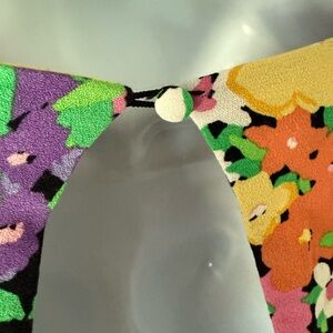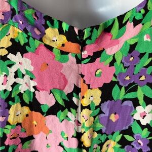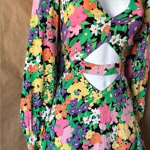 Vibrant floral dress with a V-neck and long sleeves. Features a colorful pattern with green, pink, orange, and black hues. Size large