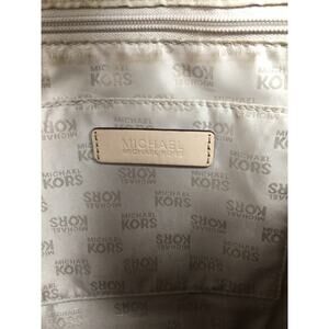 Charcoal metallic look to body of the bag. Pretty taupe lining with Michael Kors Logo imprint patter. 2 long adjustable leather shoulder straps. MK circle logo charm on thin leather tether. Interior pockets.