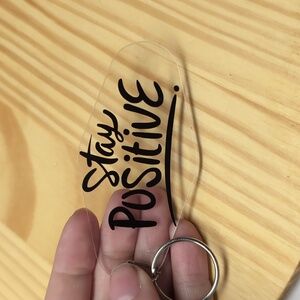 Clear acrylic keychain featuring bold black text 'Stay Positive'. Perfect for daily inspiration.