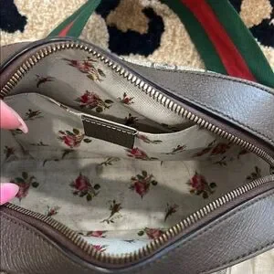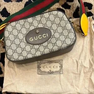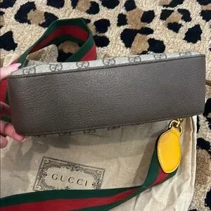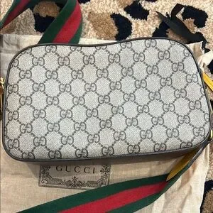 Stylish Gucci crossbody bag with iconic monogram pattern. Features a green and red strap with yellow accents.