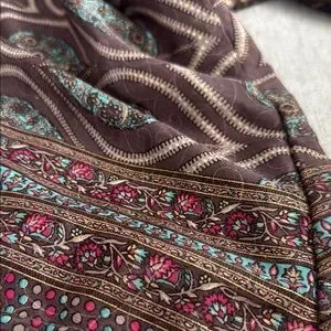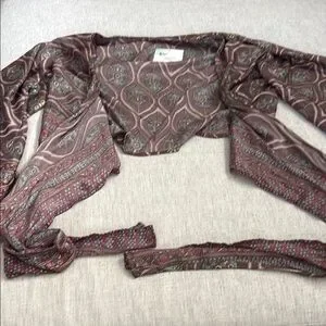 Stylish bohemian wrap top with intricate patterns. Features bell sleeves and a tie waist. Perfect for a chic look.